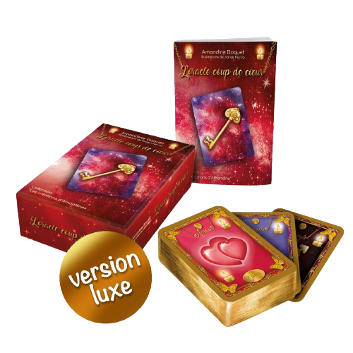 L’oracle coup de cœur est composé de 70 cartes au format 100mmx80mm avec ses magnifiques tranches dorées, livré dans une belle boîte rigide dans laquelle vous y trouverez un livret d’une centaines de pages en couleur vous expliquant la significations de chaque cartes et de précieux conseils pour utiliser au mieux votre oracle. Il est entièrement conçu pour répondre principalement aux questions d’ordre sentimentales. Cet oracle est coloré, intuitif et incroyablement précis dans ce qu’il vous raconte!