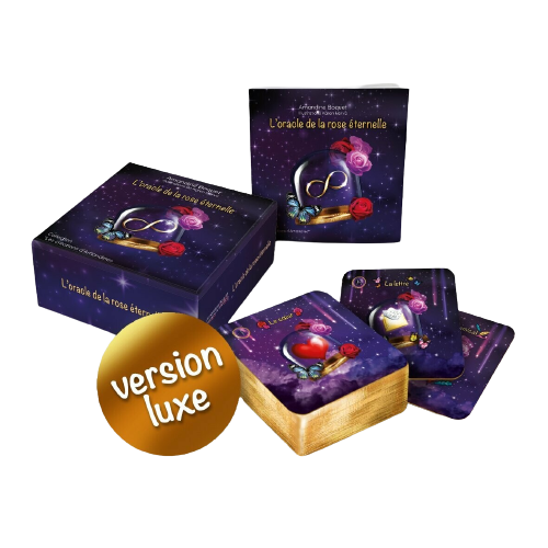 L’oracle de la rose éternelle d’Amandine Boquet Version luxe comprenant : le jeu de 80 cartes au format 80x80mm et ses tranches dorées et un livre explicatif dans un joli coffret.